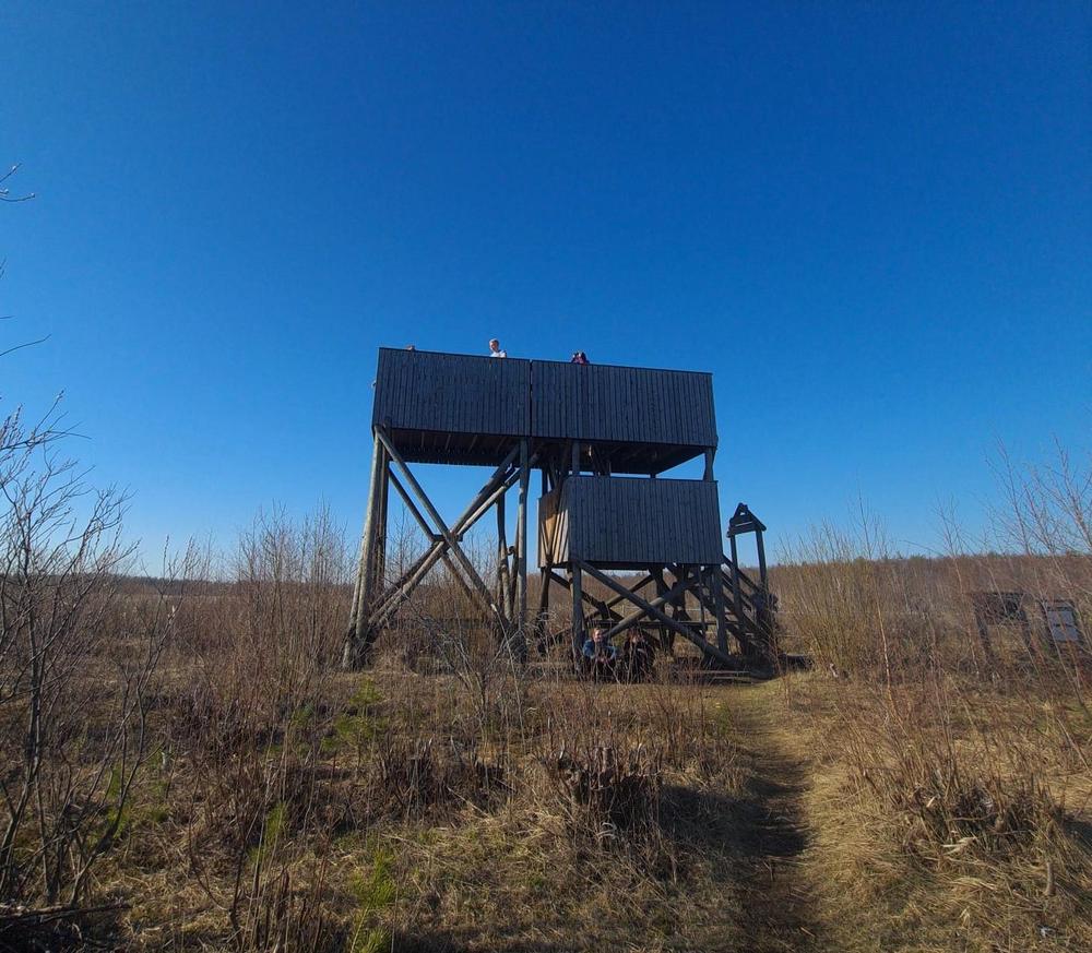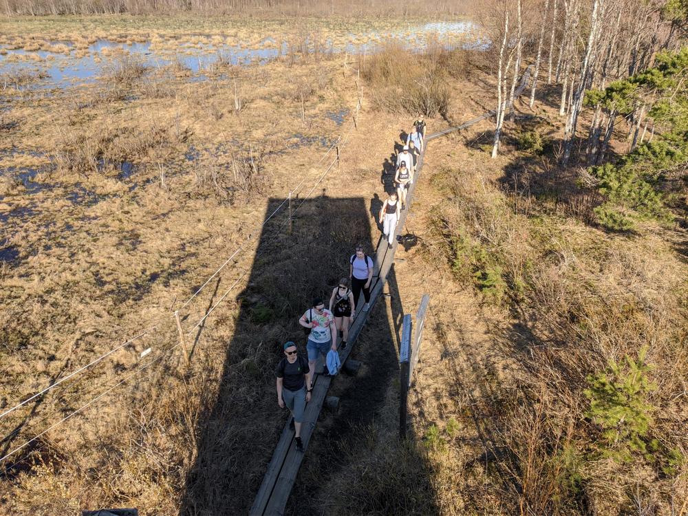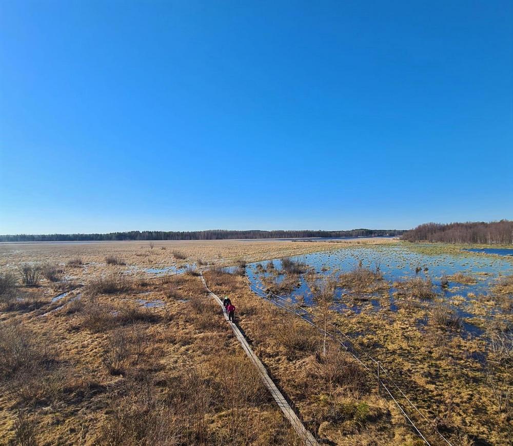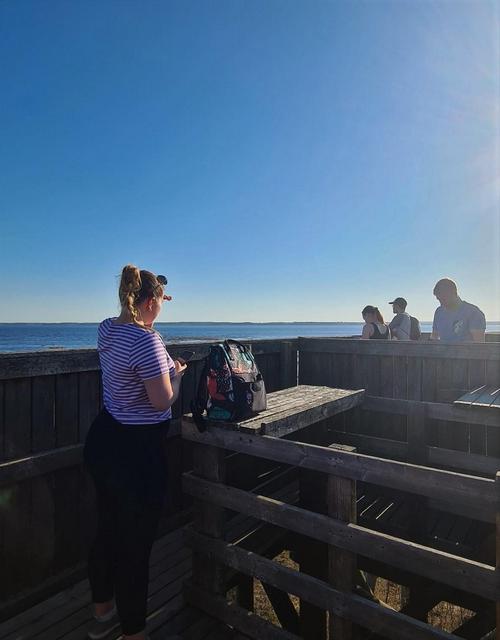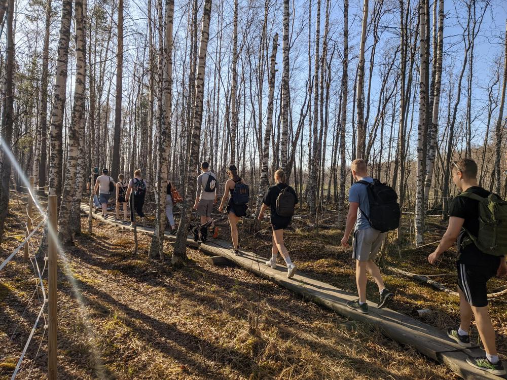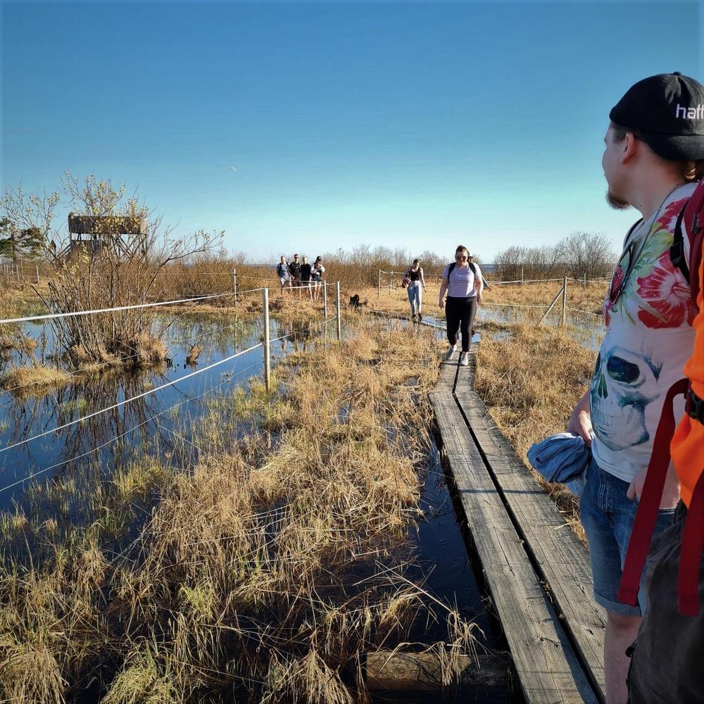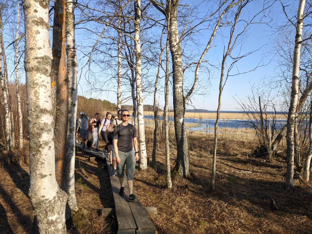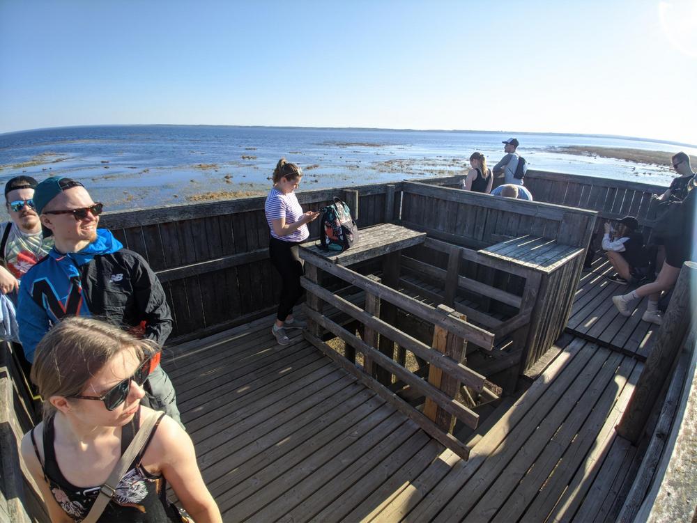Lintutornista käsin pääsimme ihastelemaan suistoaluetta lintuperspektiivistä. Näimme myös lintuja, lokkeja enimmäkseen, mutta varmasti rantaheinikossa piileksi muitakin lintuja pesimispuuhissaan. Joka tapauksessa näkymät olivat oikein hienot. Lintutornilta lähtiessämme pohdimme, kuljemmeko samaa reittiä takaisin Aavarannalle, mutta päätimme palata rannalle eri reittiä pitkin maisemien uutuuden vuoksi. Reitti osoittautui haastavammaksi kuin tuloreittimme. Jalkamme saivat mukavan virkistyksen veden alle joutuneiden pitkospuiden johdosta, mutta ainakin siinä vaiheessa kaikkien mielestä kenkien ja jalkojen kastuminen tuntui vain mukavalta lähes kesäisessä helteessä. Seuraavaksi edessä oli vetistä metsäpohjaa ja ojia, joiden yli pääseminen vaati pientä rytteikössä taituroimista ja parkour-taitoja. Rohkeimmat koettivat onneaan ja loikkivat vesialueiden yli. Kaikki selvisivät ehjin nahoin pois reitiltä ja pian pääsimmekin takaisin lähtöpisteeseemme. Aavarannalla istahdimme hetkeksi katselemaan järvelle ja syömään eväitämme. Osa porukasta oli tosin syönyt eväänsä jo ennen lähtöä Alkukivillä nälän yllättäessä, mutta onneksi Siirillä oli retki(viini)pullo mukana. Evästaon jälkeen lähdimme suuntaamaan takaisin kohti Careliaa.