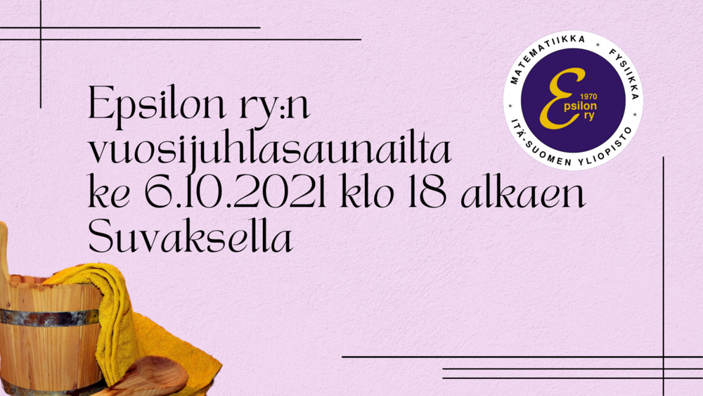 Tervetuloa Epsilonin syksyn 2021 ensimmäiseen saunailtaan, jota vietetään vuosijuhlaviikon tunnelmissa Suvaksella ke 6.10. klo 18 alkaen! Tapahtuma on ilmainen.