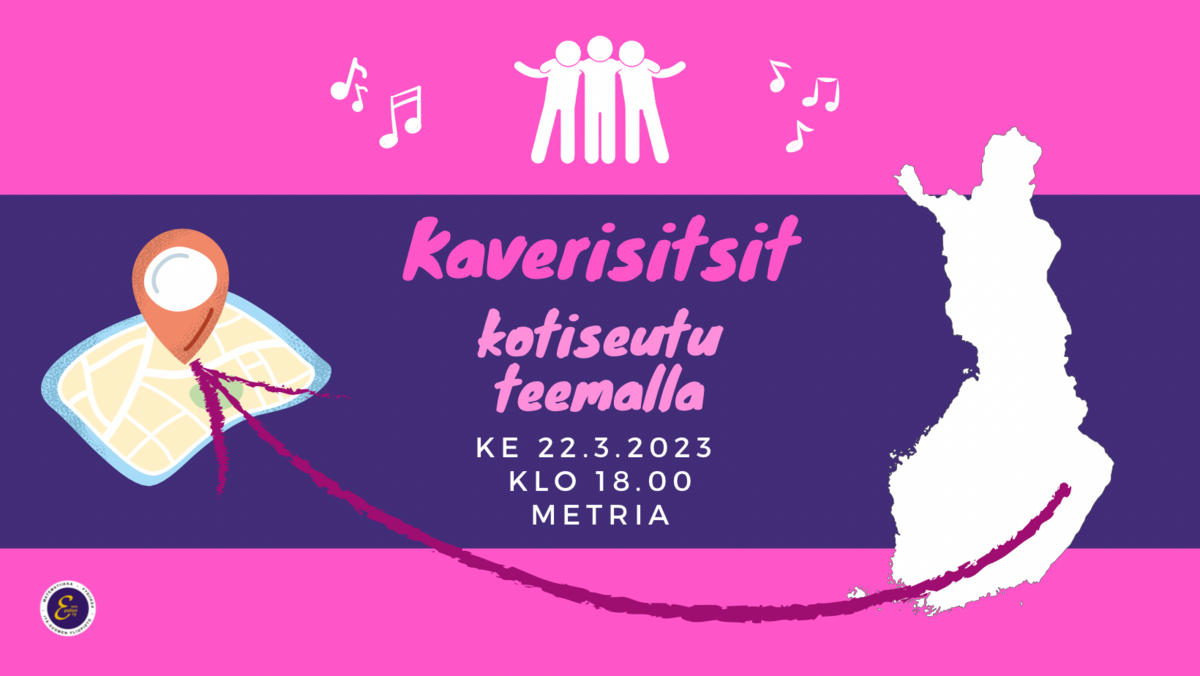 Kaverisitsit sitsataan Metrialla 22.3. klo 18-22 teemalla kotiseutu. Sitsit maksavat 11€ sisältäen ruoat, muutaman juoman ja sisäänpääsyn. Omia virvokkeita saa ottaa lisäksi mukaan ja oma vesipullo on suositeltava. Muista myös oma muki!