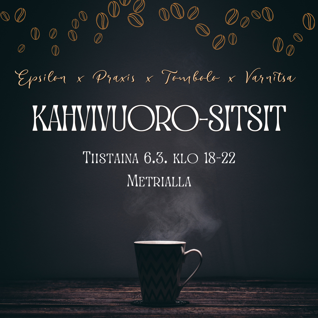 Ei hätää, sillä nyt Epsilonin, Praxiksen, Tombolon ja Varnitsan järjestämillä kahvivuoro-sitseillä tämä kaikki mahdollistuu. Osta lippusi, pistä haalarit päälle, ota upein kahvikuppisi mukaan ja tule viettämään Suurinta kahvivuoroa Metrian aulaan Keskiviikkona 6.3 klo 18-22! Ei tarvetta kahvitauoille – täällä jokainen hetki on kahvivuoroa! Älä jää paitsi, hanki lippusi nyt ja valmistaudu elämäsi kahvivuoroon!