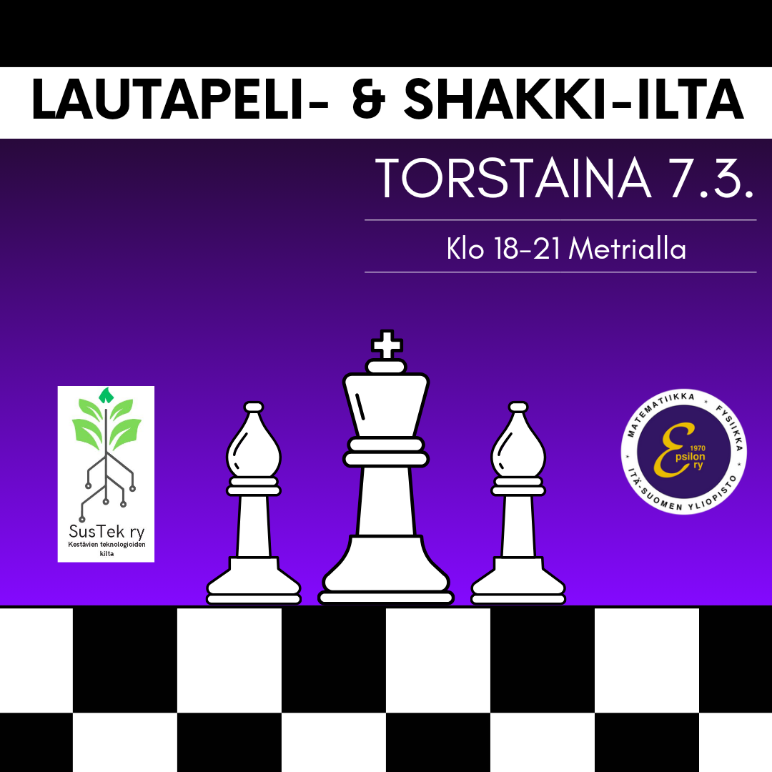 Epsilonin ja Sustekin lautapeli-ilta järjestetään Metrialla 7.3. klo 18-21 ja toivomme paikalle ennen kaikkea innokkaita shakinpelaajia. Muitakin lautapelejä on tarjolla ja paikalle saa tulla matalalla kynnyksellä.