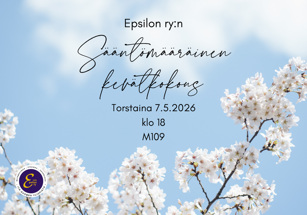 Tervetuloa osallistumaan yhdistyksemme Epsilon ry:n sääntömääräiseen kevätkokoukseen tiistaina 07.05.2026 klo 18 Metrialle (Yliopistokatu 7) M109 luentosaliin. Liitteenä kevätkokouksen esityslista. Kokouksessa on pientä tarjoilua.